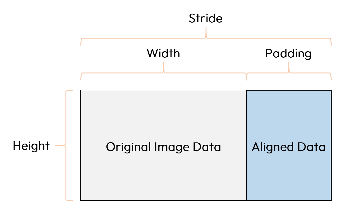 Stride is the actual size of the space occupied by each line of an image when it is stored in memory. Most computer processors work with 32-bit or 64-bit, so the processor will read the complete amount of data at a time, preferably in multiples of 4 bytes or 8 bytes, if other values, the computer will need to specialize in processing, which will lead to a reduction in efficiency. In order to efficiently process the images by the computer, it is common to fill in some extra data on top of the original data to achieve 4-byte or 8-byte alignment. The operation of alignment is also called Padding, and the actual alignment rules depend on the specific hardware and software system.