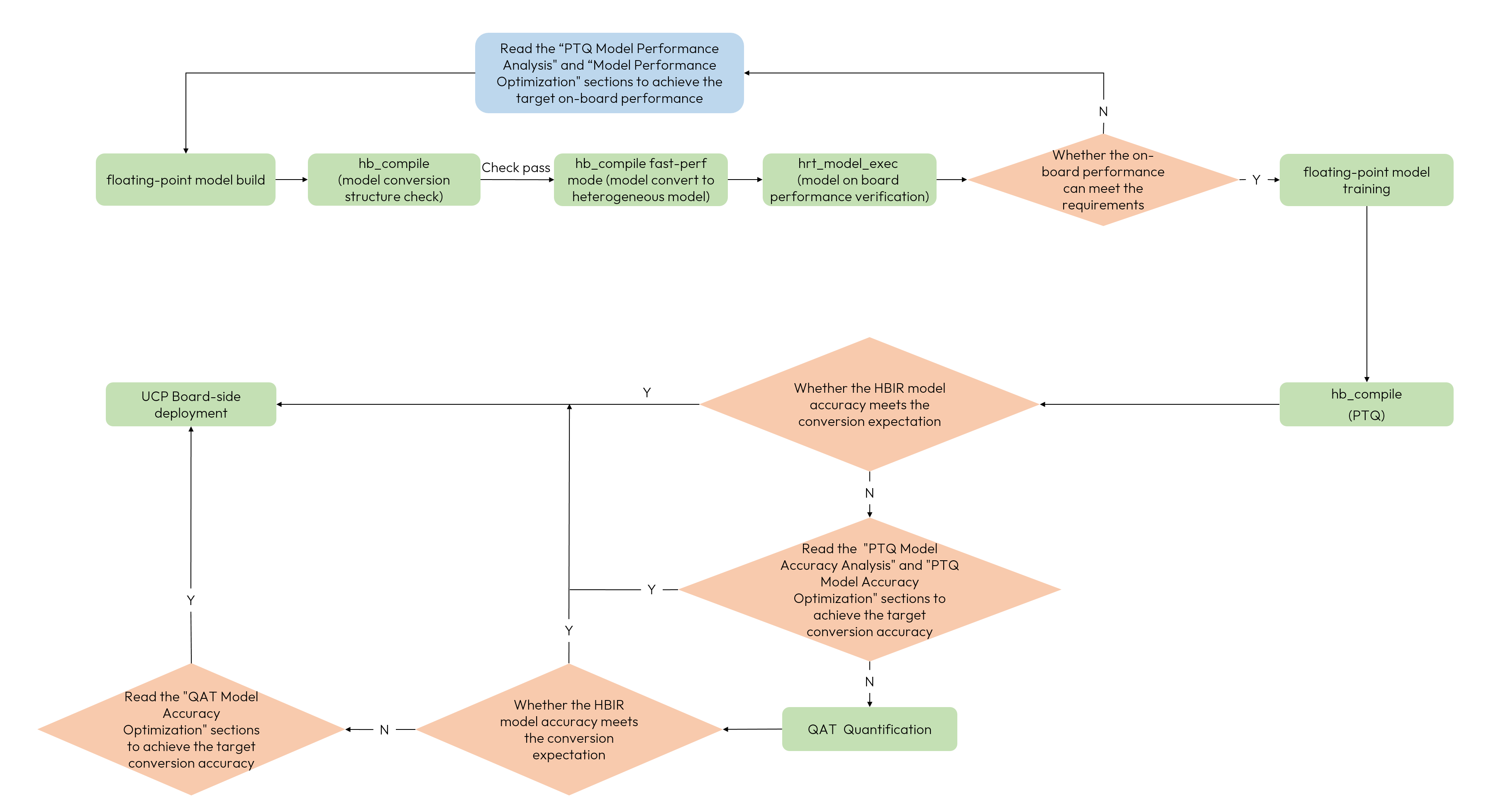 The overall workflow of using the toolchain is shown in the figure below. We recommend that you to try the PTQ method first to see if it meets your requirements on the deployment accuracy and performance.