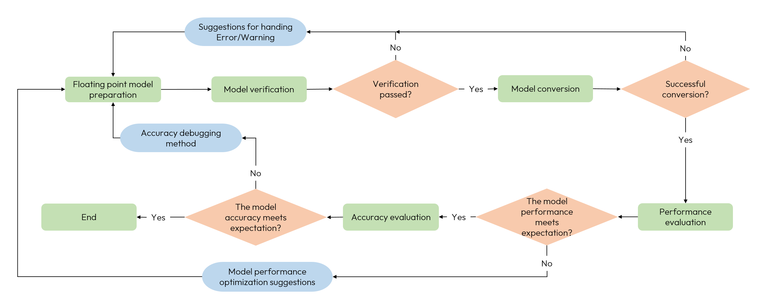 The Model Checking stage is used to ensure that the model is computing platform compliant. We provides specified tools to complete model validation, and for non-compliance, such tools will explicitly give you the specific operator information for the non-compliance, so that you can easily adjust the model with the description of the operator constraints. For more information, please refer to the Model Checking.